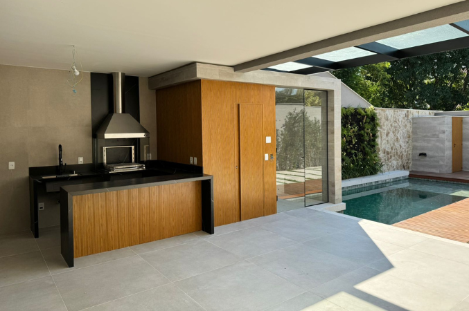 Quintal com 4 vagas de garagem, sala ampla e arejada, lavabo, cozinha moderna com ilha e área de serviço completa.
